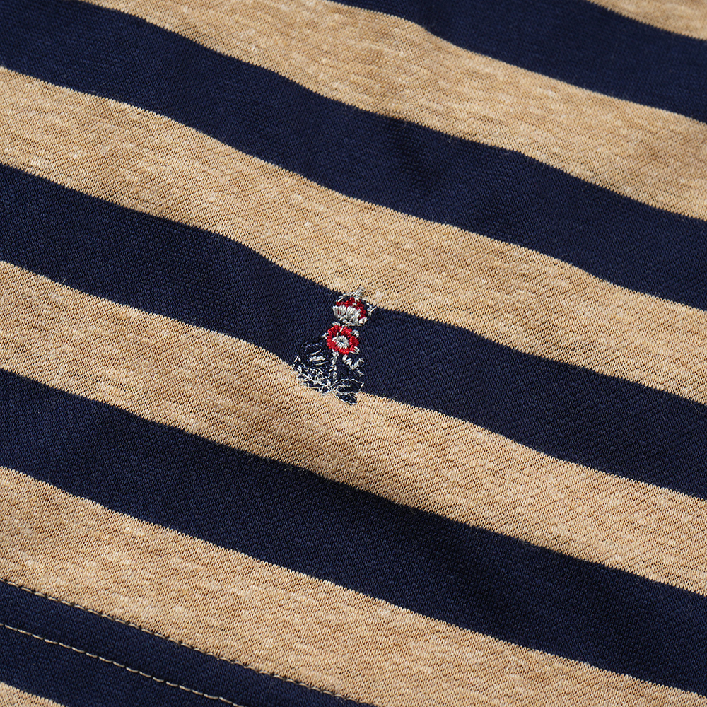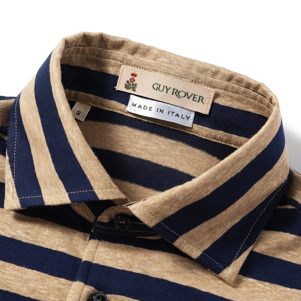 バランスの良いセミワイドカラーに、ブラウンよりの杢ベージュにネイビーで、落ち着きのあるボーダー柄。