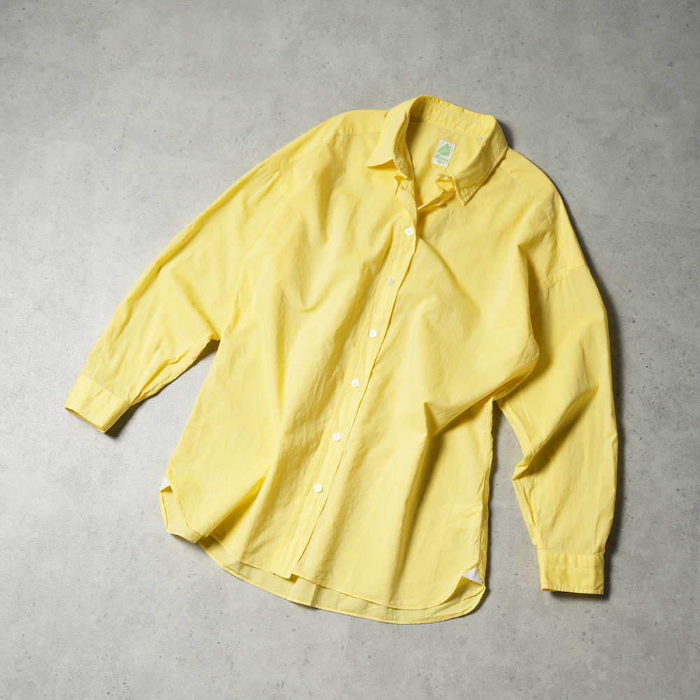 コンパクトな襟とドロップショルダーのビッグシルエットで、上品ながらもリラックス感のある雰囲気が今の気分にピッタリなシャツです。