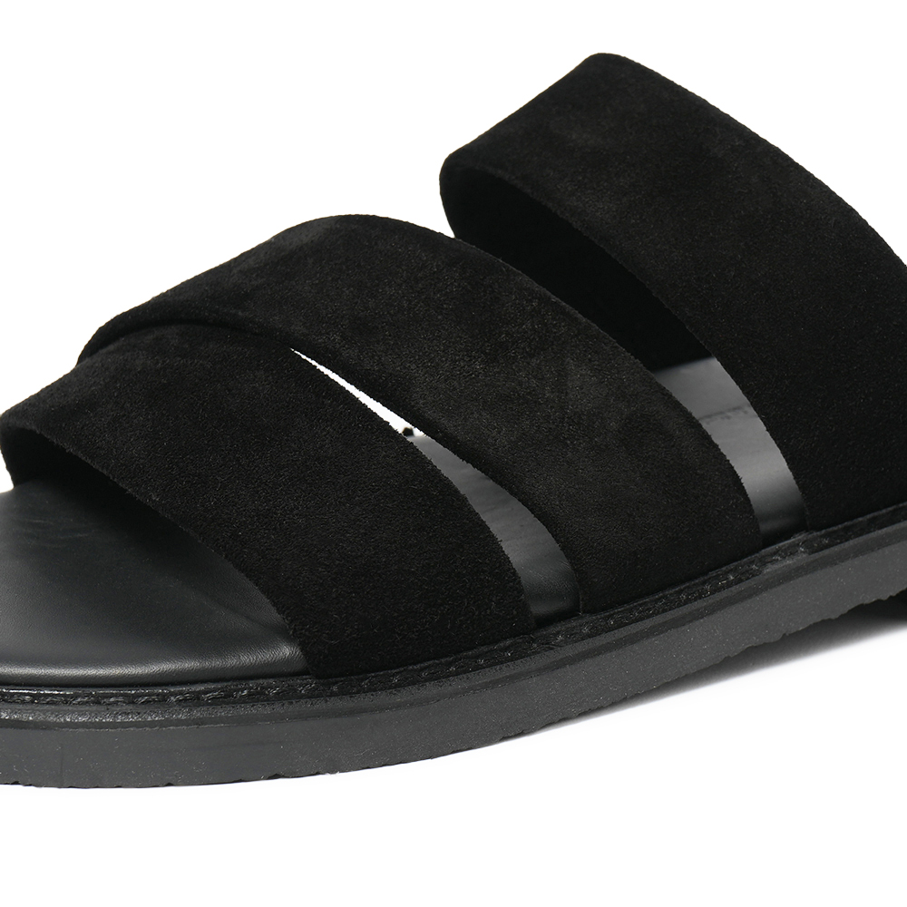 ほどよくクタっとしたスエードの雰囲気と、サンダルのラフな雰囲気がとても良い組み合わせ。