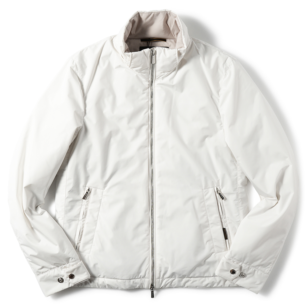 ショート丈のスポーティなブルゾンを、パキッとした白で着たらエレガントそのもの。