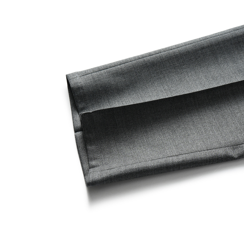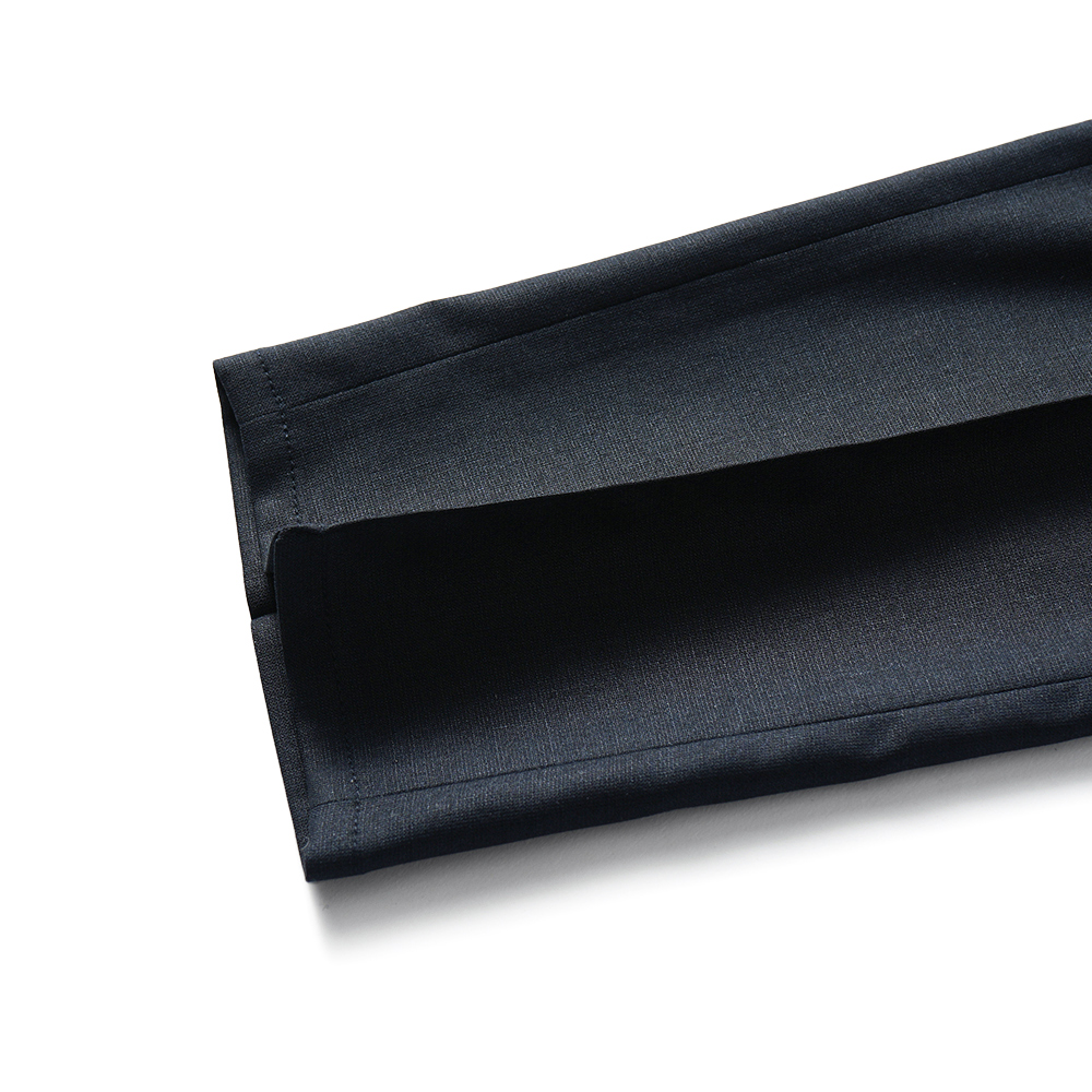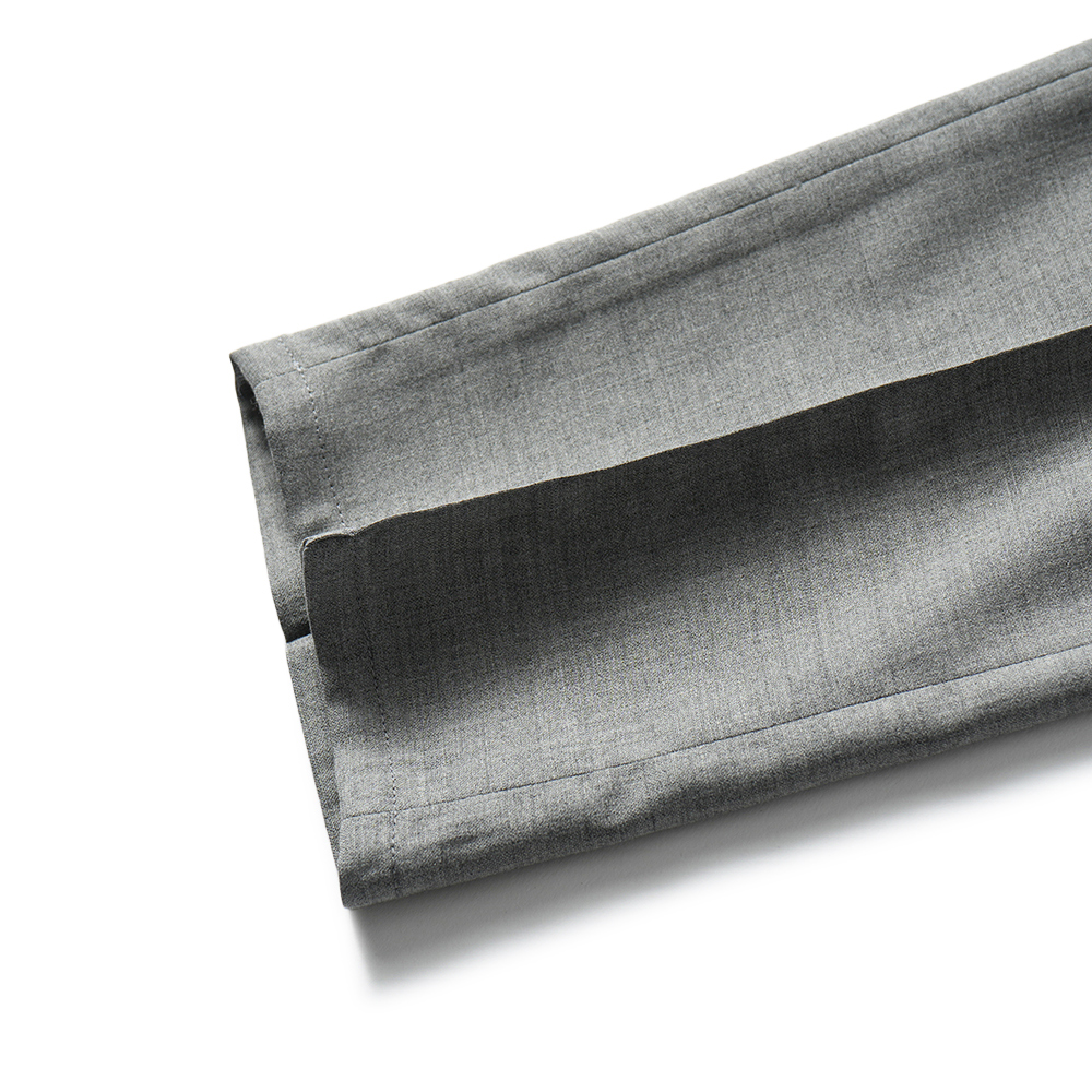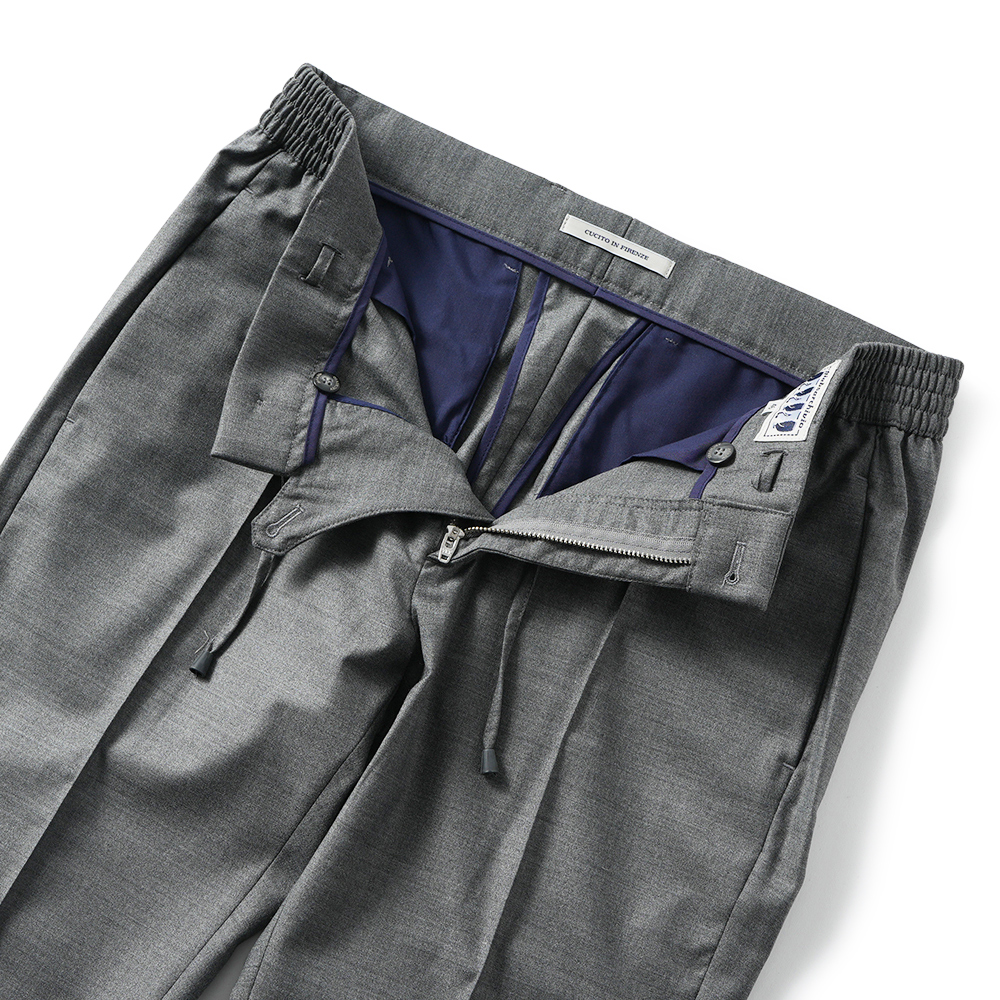 ポリエステル、ウール、ポリウレタン、3素材をミックスして織られたテクノウールファブリックは皺になりにくく、清涼感のあるタッチ、ストレッチ入りによる快適な着用感。