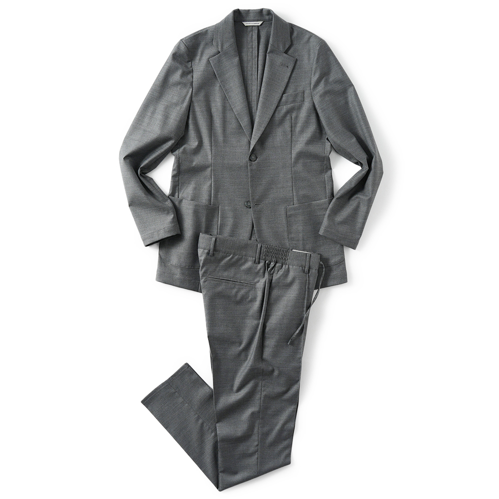 まるでシャツのような軽い着心地のジャケットと、細身&ストレッチが嬉しいパンツ。