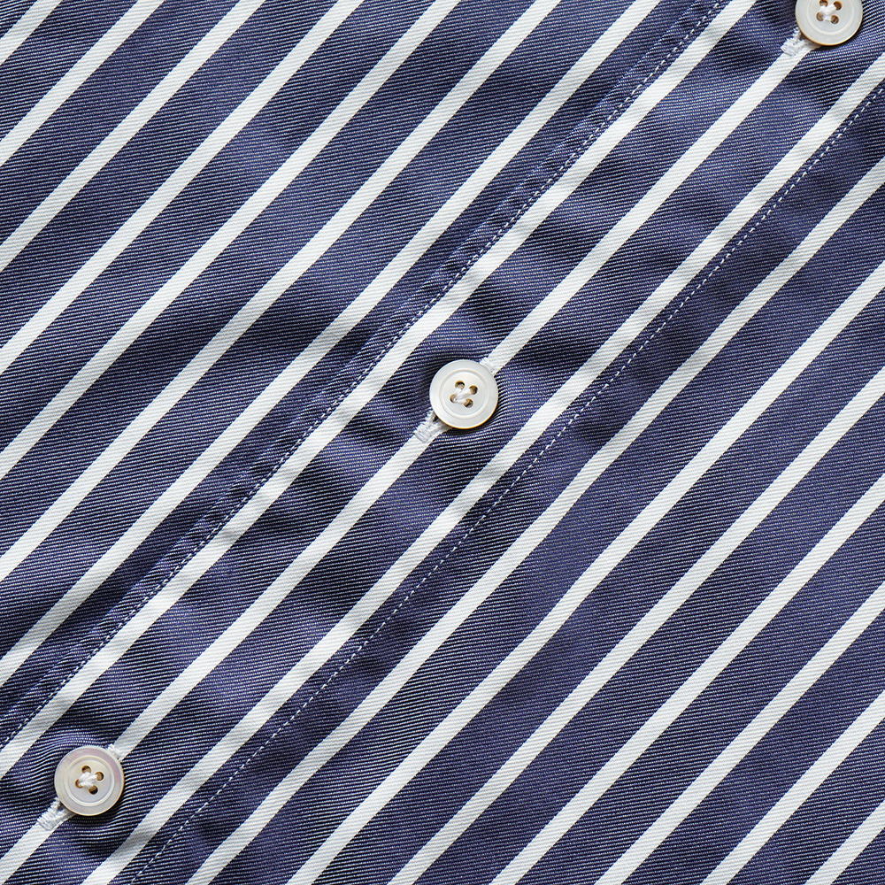 ネイビーに白抜きが映える、やや太めのストライプは、色目と生地感とが相まってとてもエレガントな雰囲気。