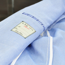 襟裏や内ポケット口にブルーのギンガムチェックの別生地が施され、