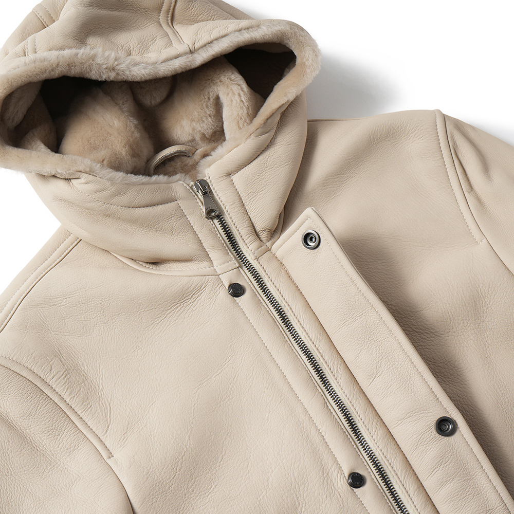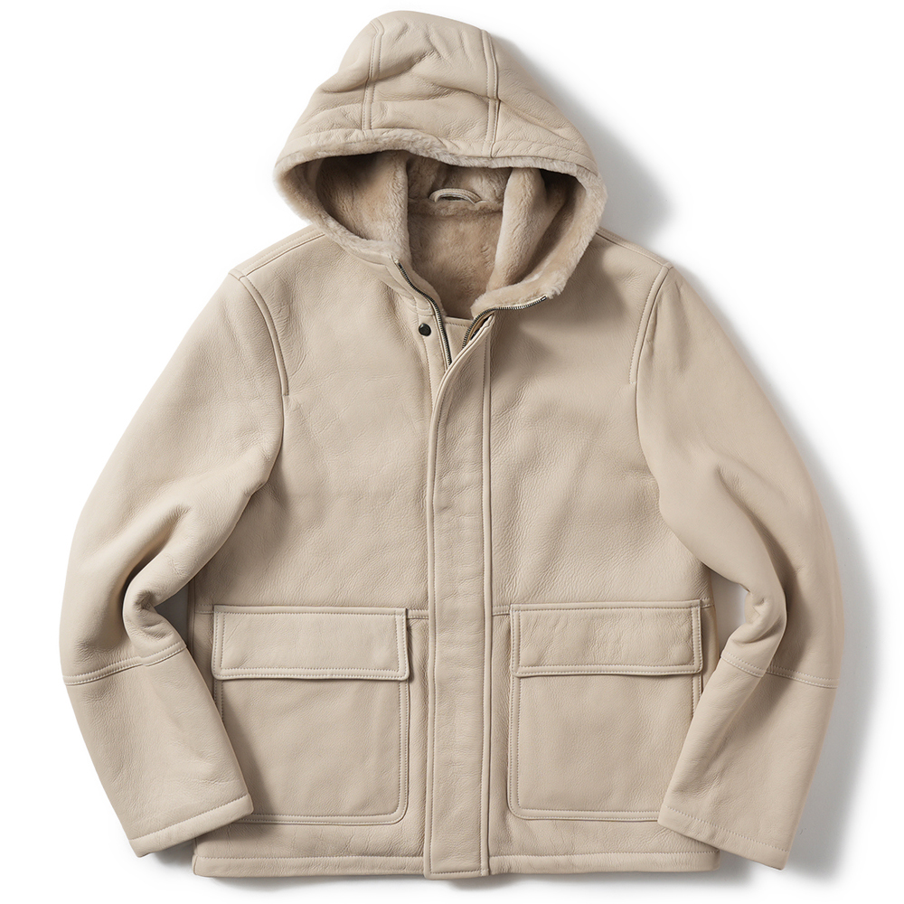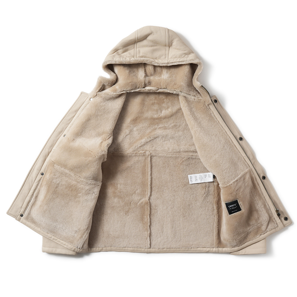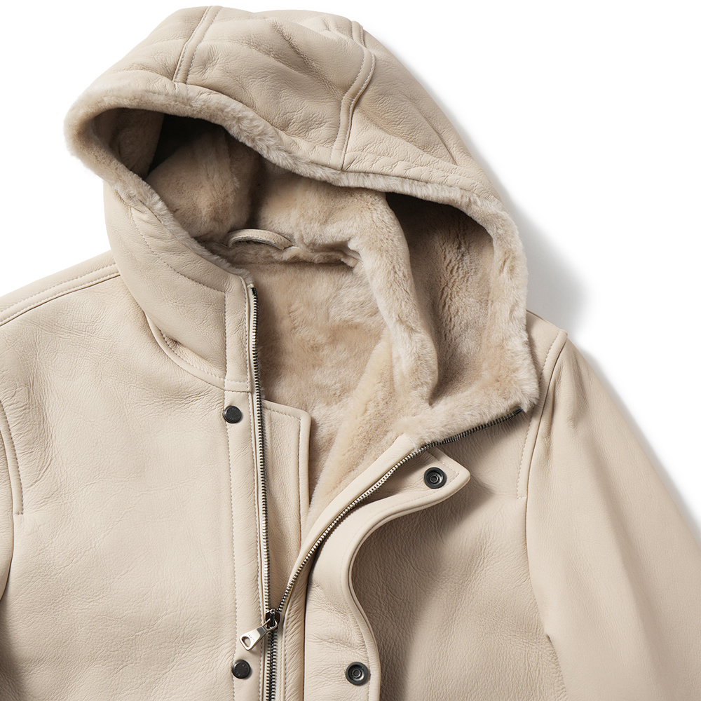 身頃一体となったフードの流れるようなディテールがとても美しく、ムートンならでは程よいボリューム感も絶妙。