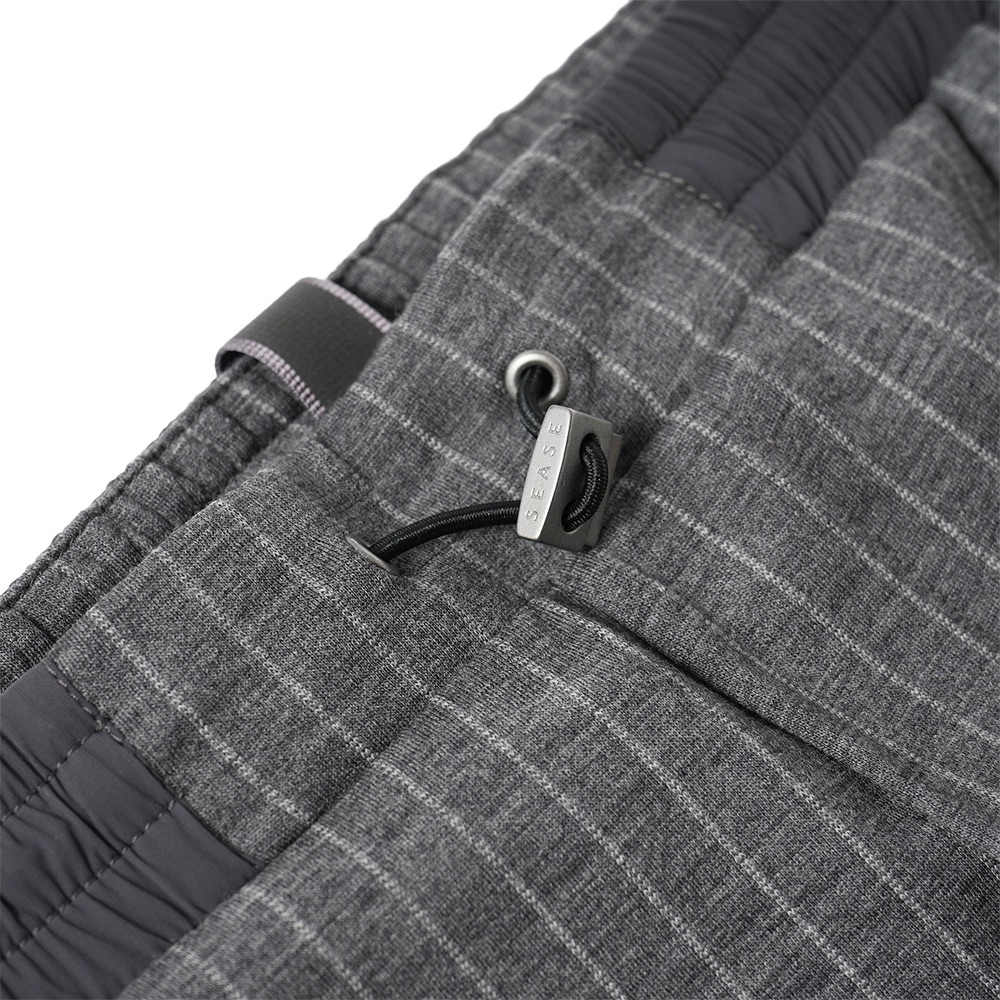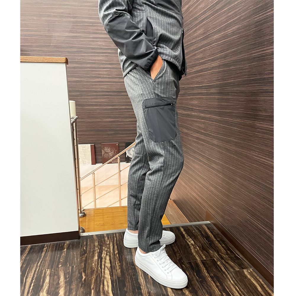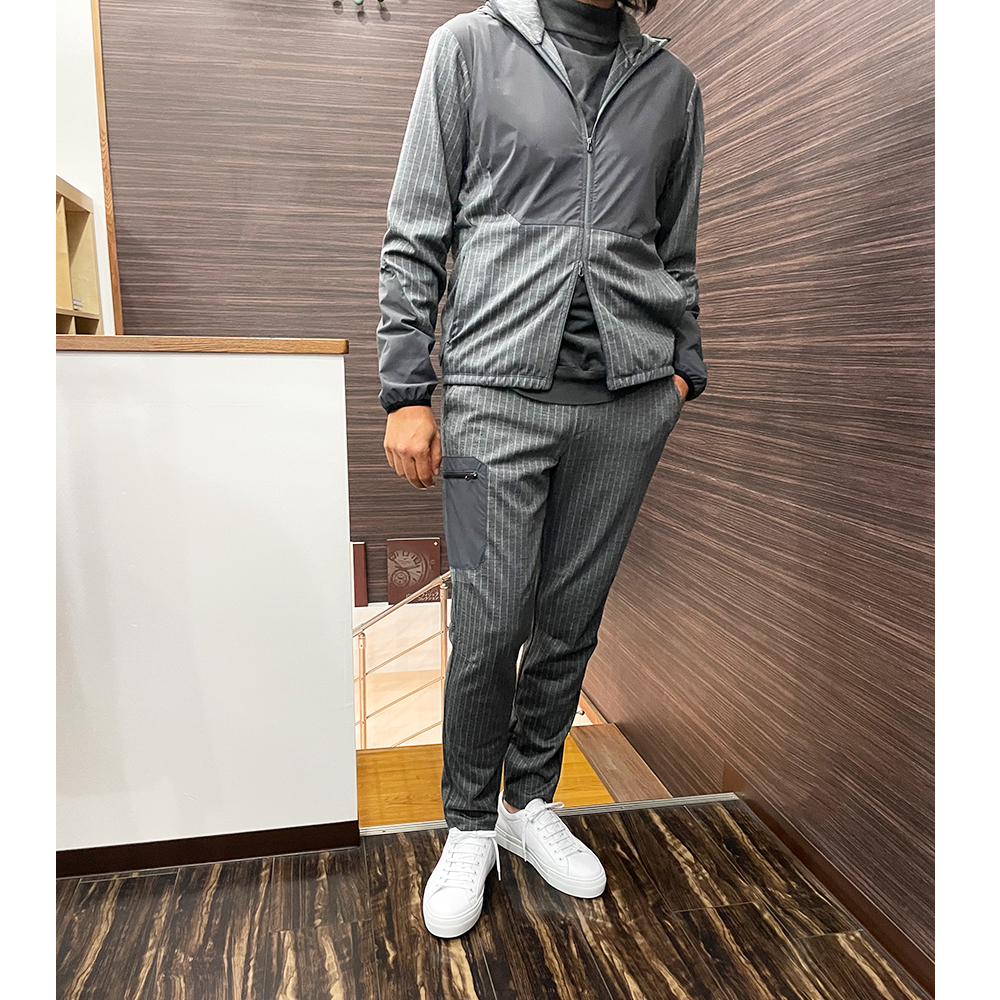 なんならそのままスーツにしてもクールに決まるストライプウールジャージーをメインに、切り替えパネルにもスポーツリッチなストレッチナイロンを採用。