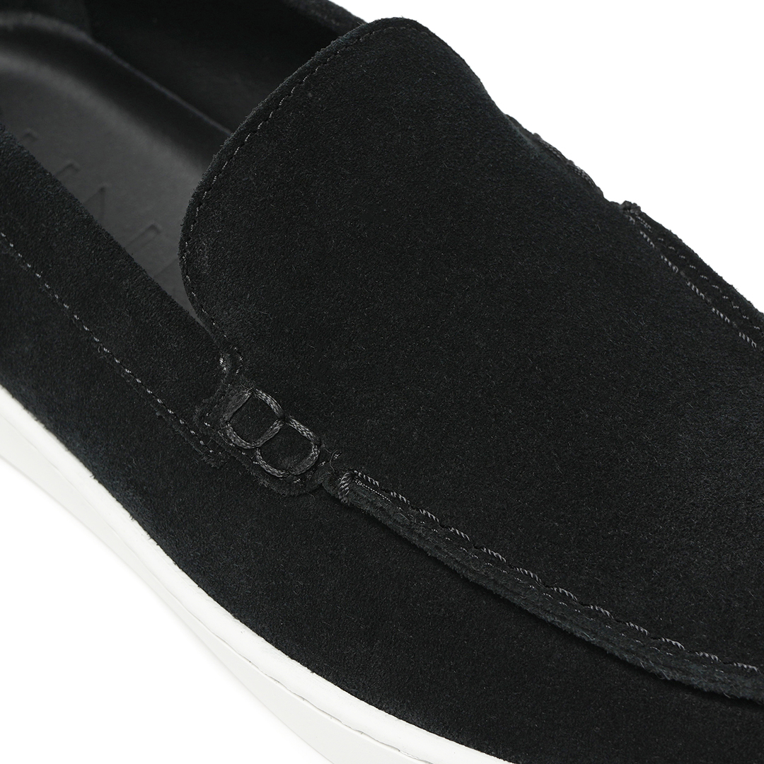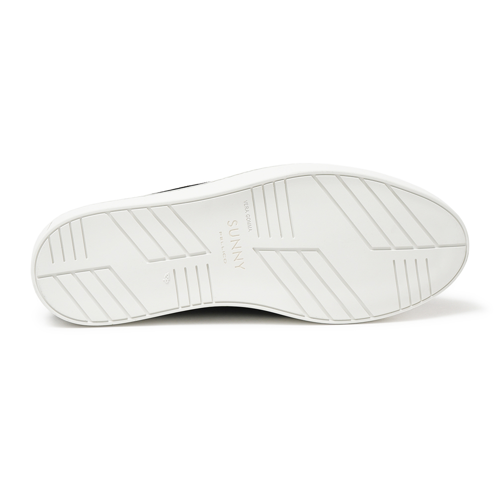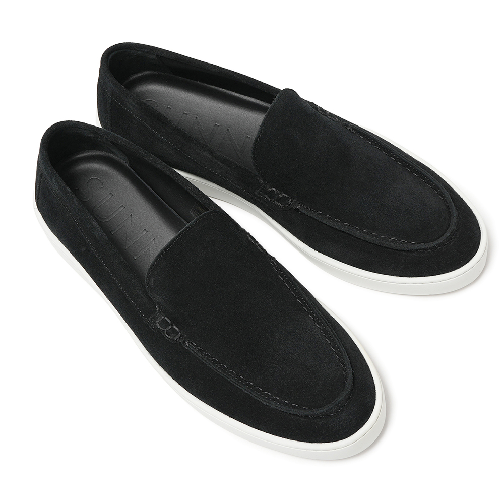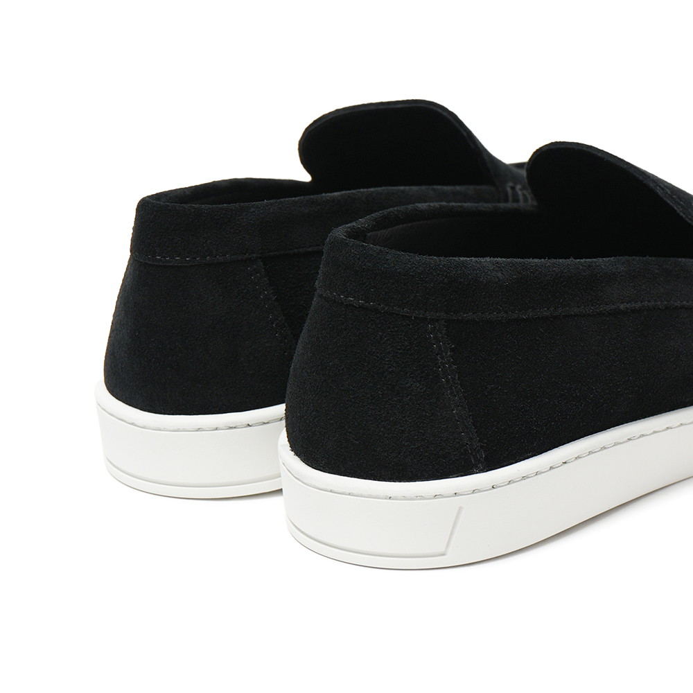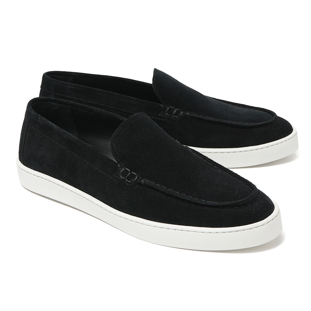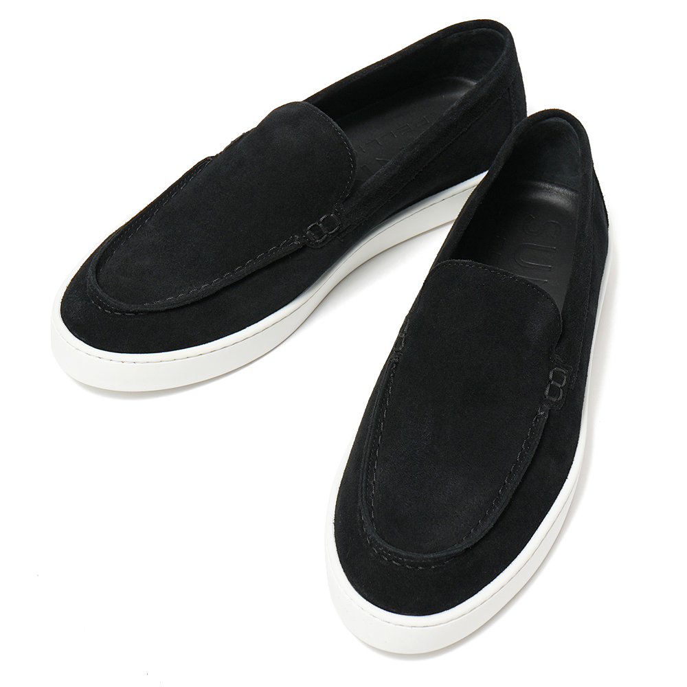 デッキシューズをアレンジしたようなシンプルなスリッポンシューズで、カジュアルな雰囲気ながらセットアップやジャケパンスタイルなどのキレイめコーディネートにも使える万能な一足。