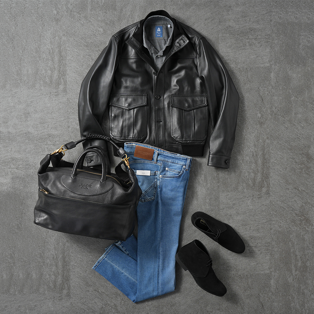 定番のレザー×デニムスタイルの足元をオトナの男の色気でまとめたスタイル。