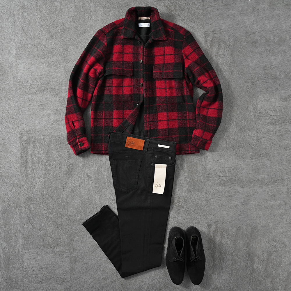 バッファローチェックのシャツアウターのインナーにはブラックが適任。