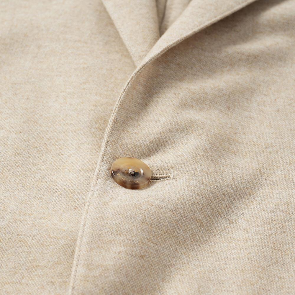 ウール・ポリエステル・ポリウレタンの3者混による上品なベージュカラーのジャケット。