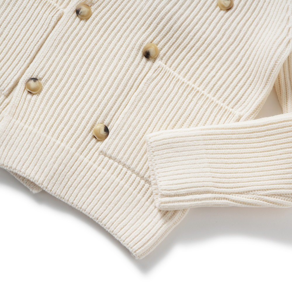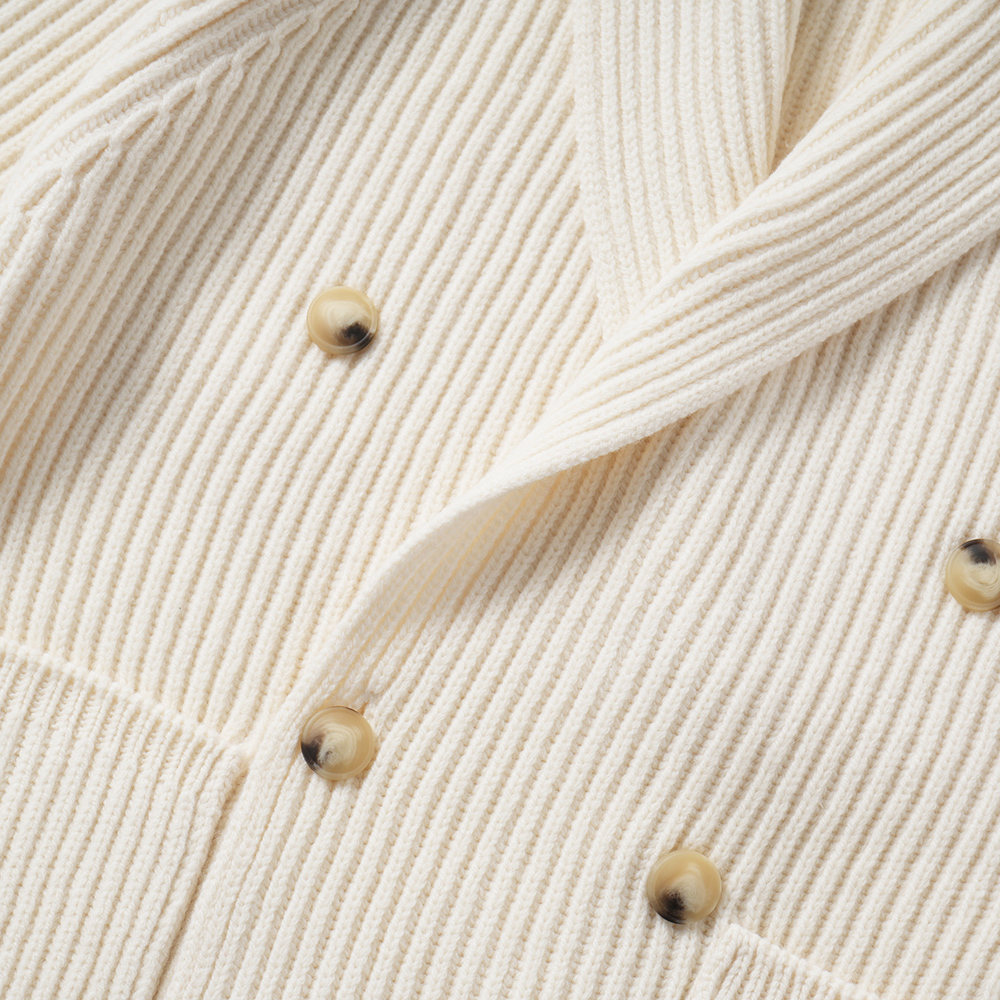ショールカラーのダブルブレステッドカーディガン。