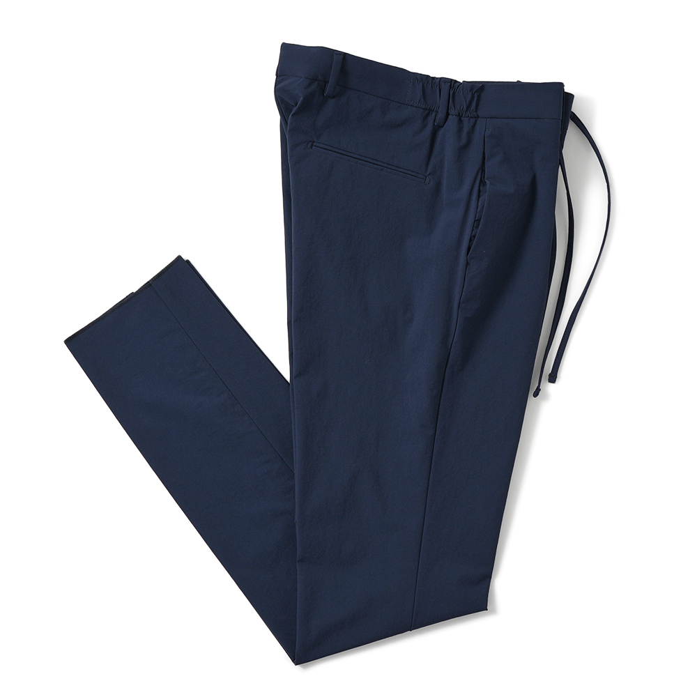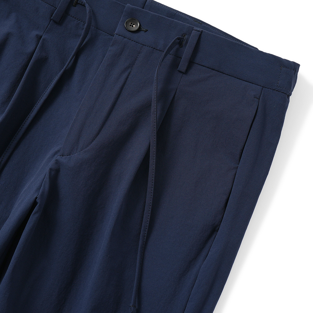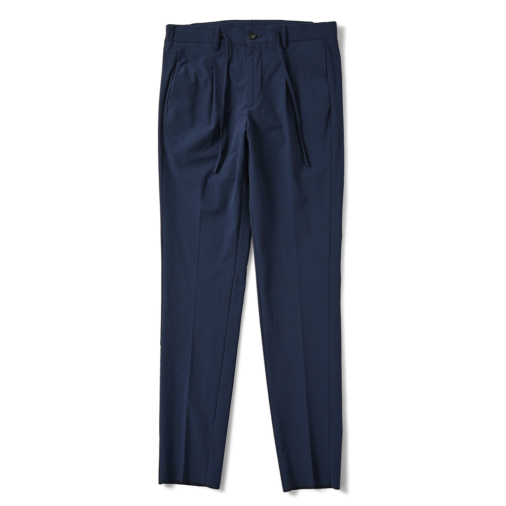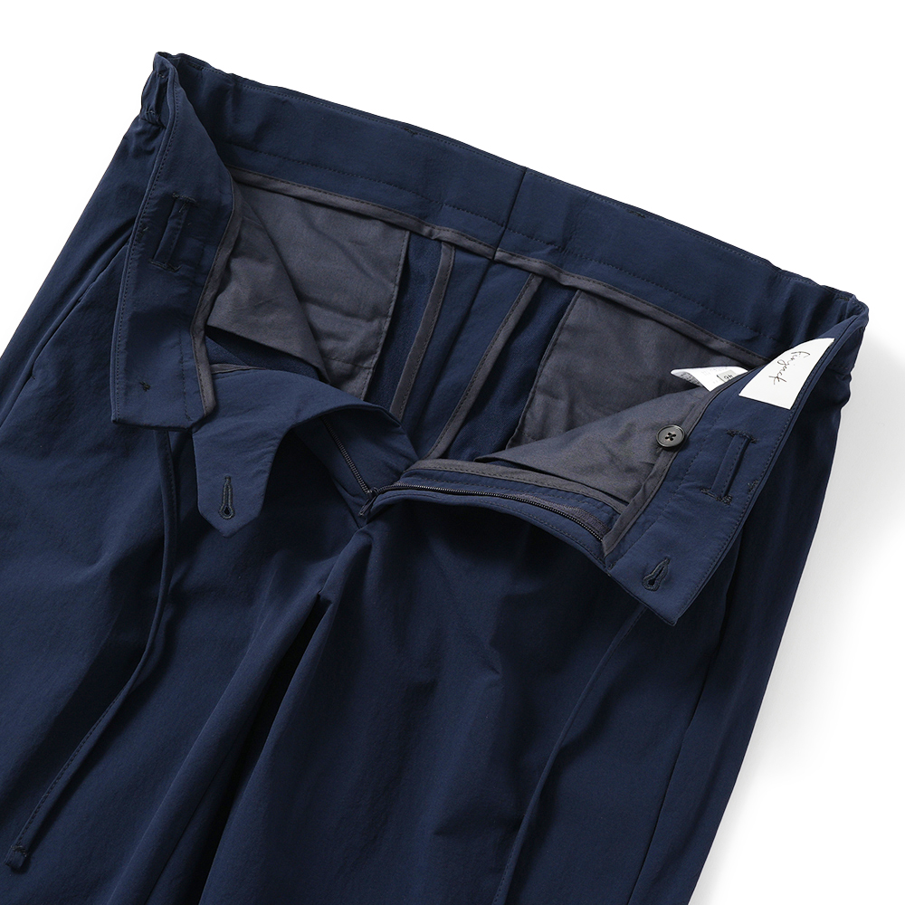 パンツは極端な絞りやタイトフィッティングにはせず、少しゆとりがあり、現代の日本の酷暑のような極端な気候にも爽やかに対応できるモダンな作りに。