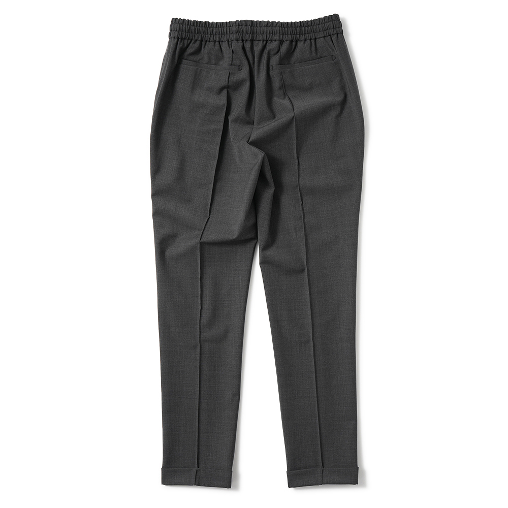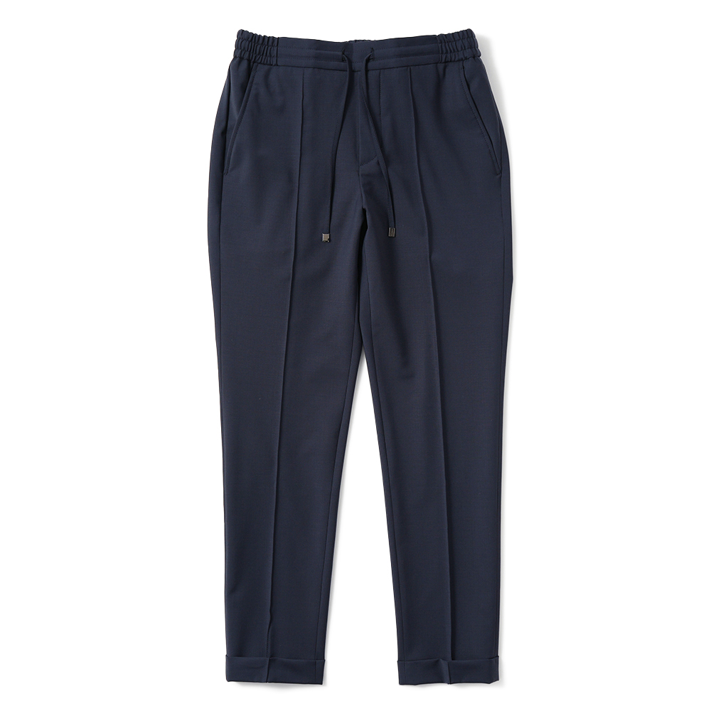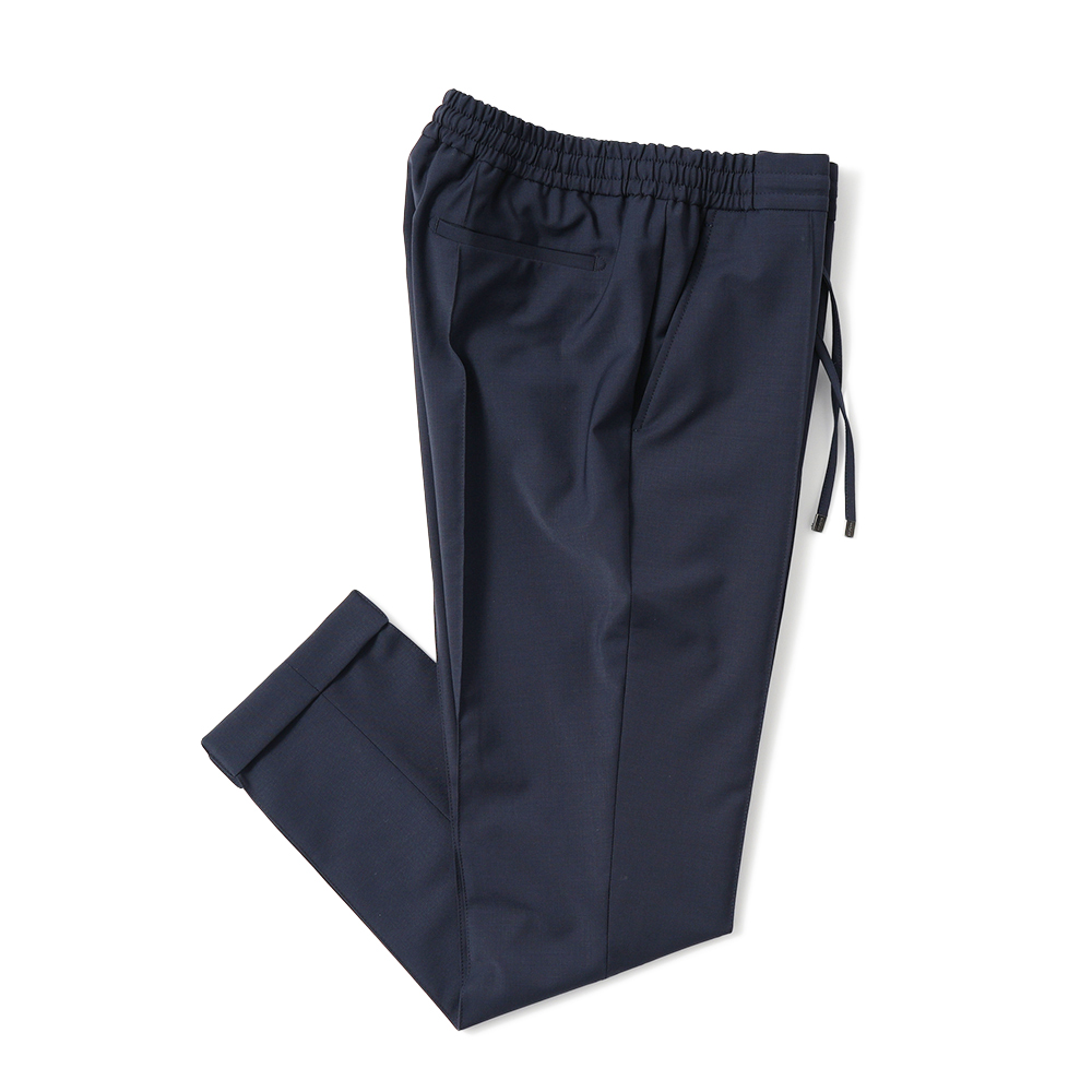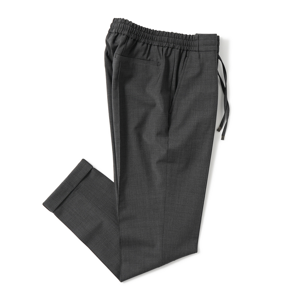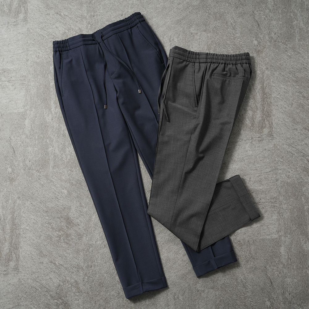 ウェストはドローコード付きのシャーリング仕様となるイージーパンツでありながら、前後に永久クリースを入れてきちんとした印象をキープ。