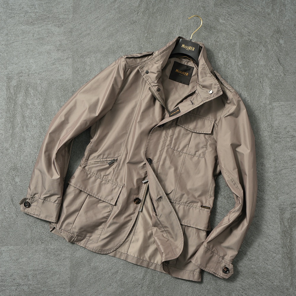 特注のスナップボタンやホーン釦、ライニングの丁寧なパイピング処理など、ムーレーらしい妥協のない仕立ては共通ディテールで抜かりなし。