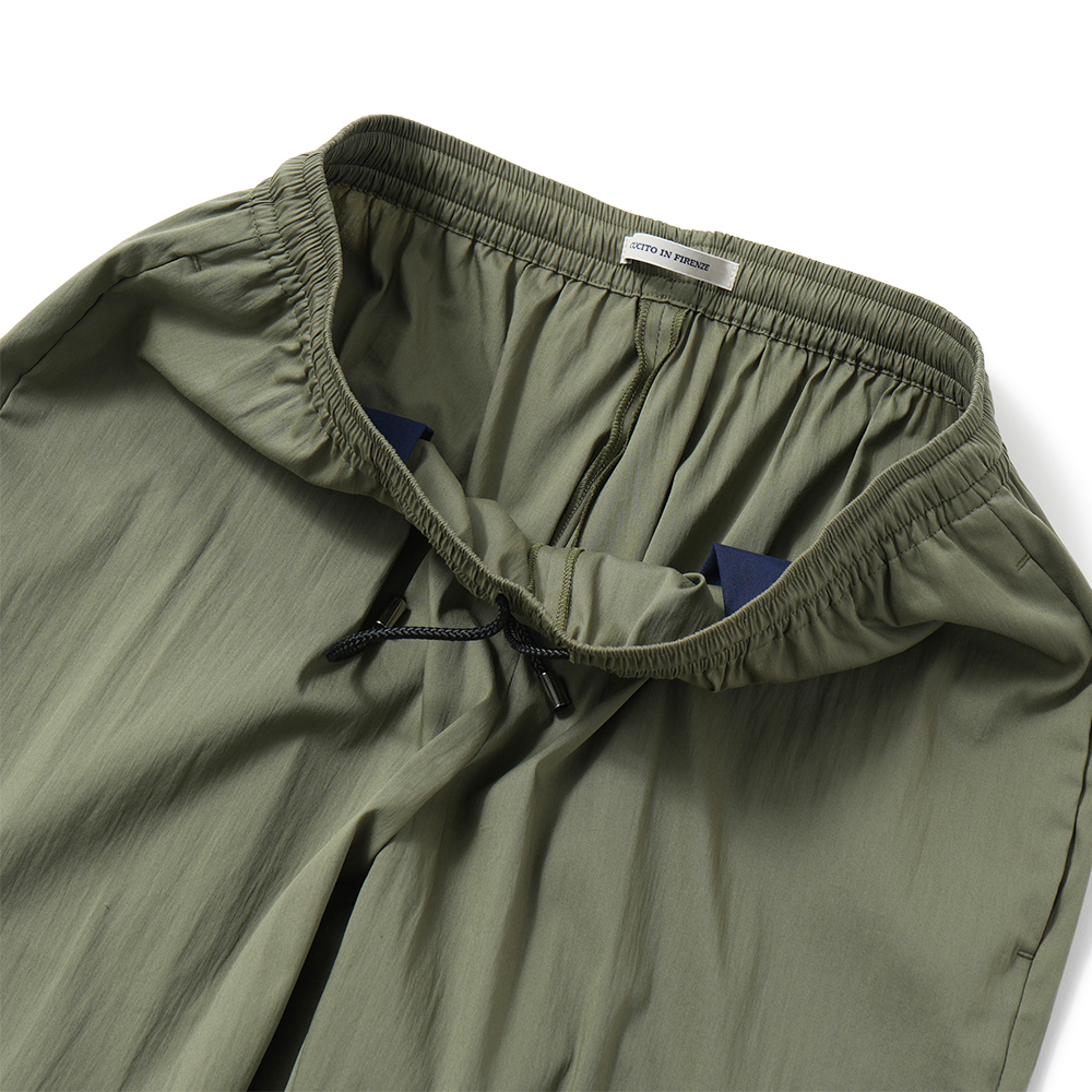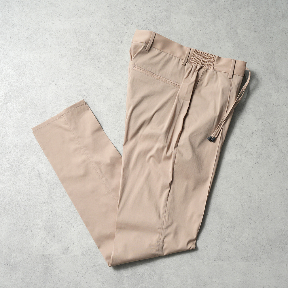 驚愕の軽さとウエストの総ゴムシャーリング仕様で窮屈感から解放しながら、得意のイタリア仕立てのスリムシルエットでエレガントさを失いません。