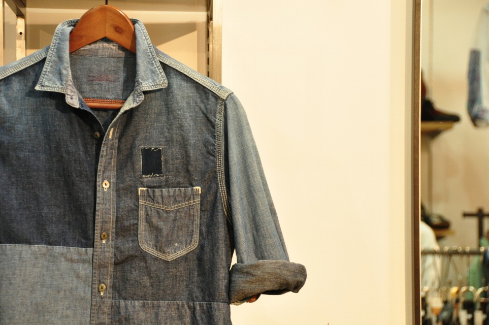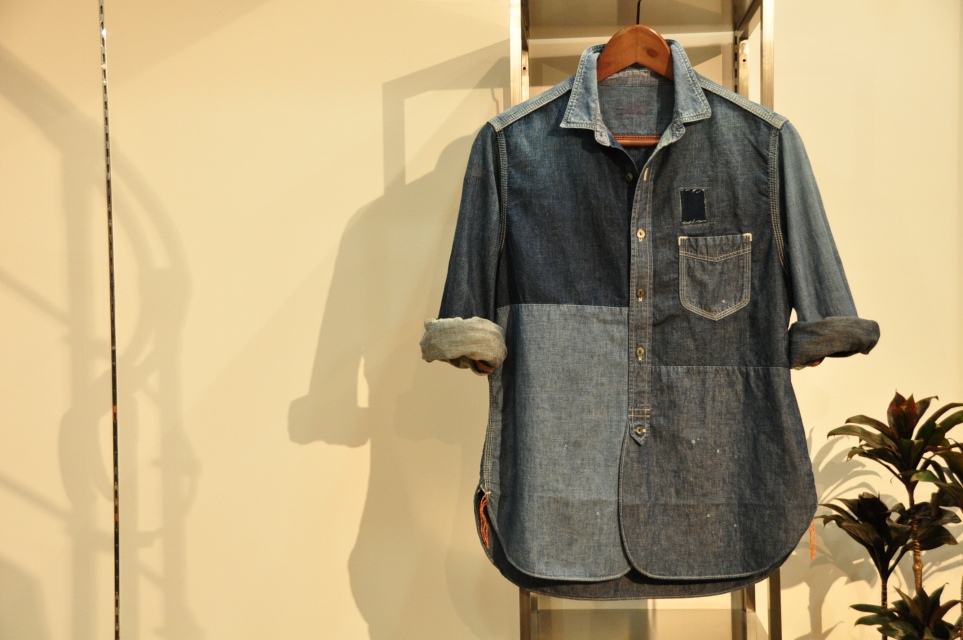ダークトーンの落ち着いた雰囲気のデニムをリメイクしたパッチワークシャツ。