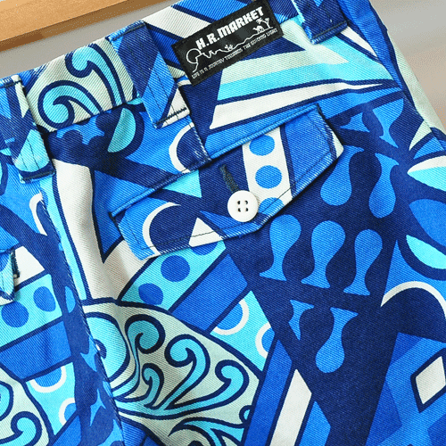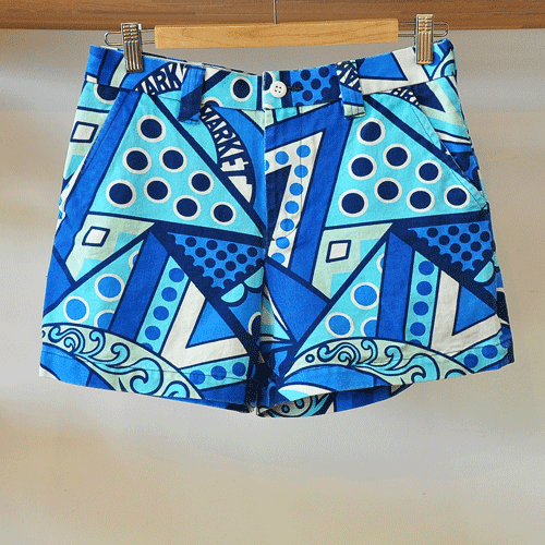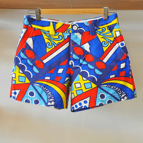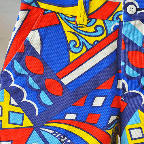 幾何学模様が特徴的なキャンバス地のショートパンツ。