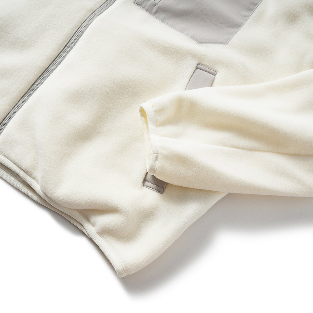 本体には、リサイクルポリエステル糸を用いたマイクロフリース素材を採用し、ふっくらとした質感と繊細な表面感が魅力です。
