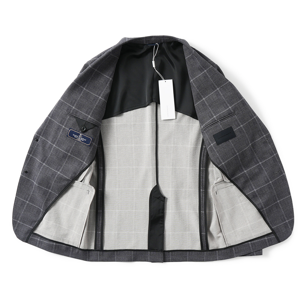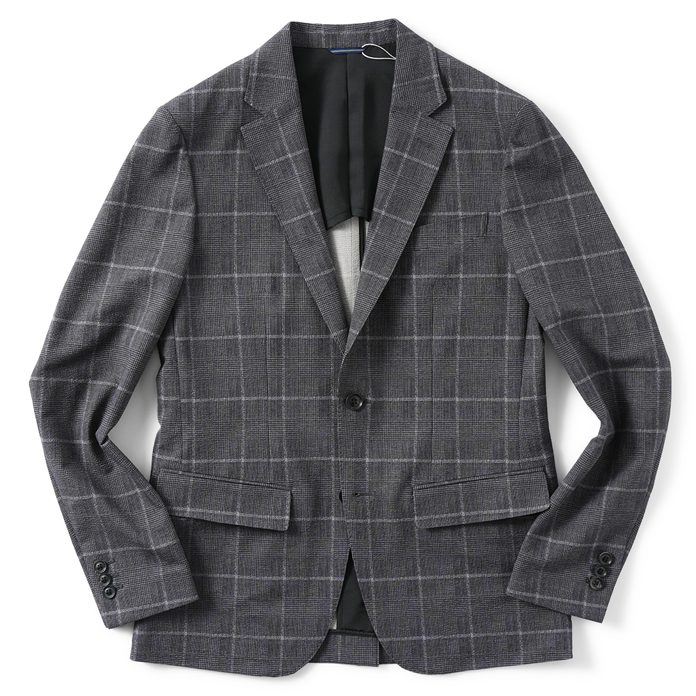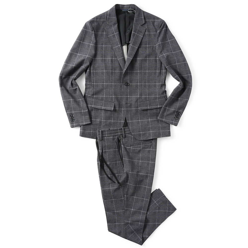 シアサッカー調の生地にチェック柄をあしらい、いつもの無地セットアップとは違った雰囲気に。