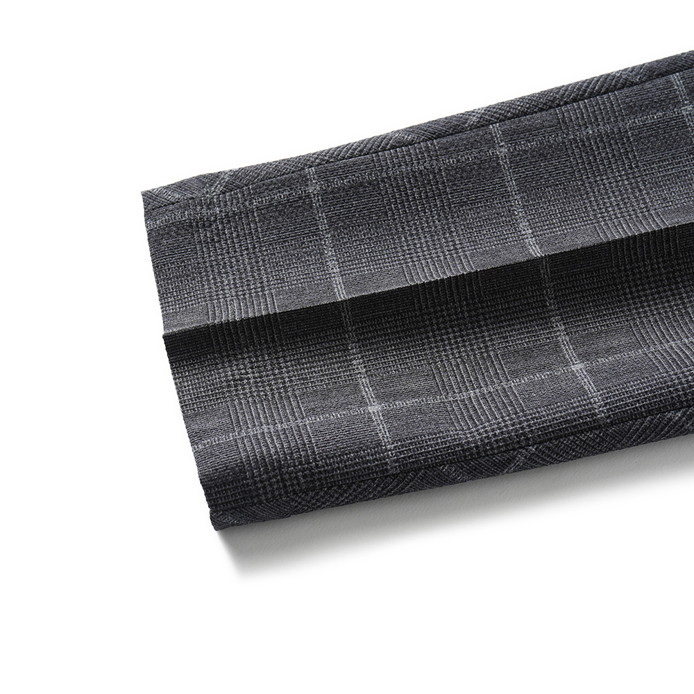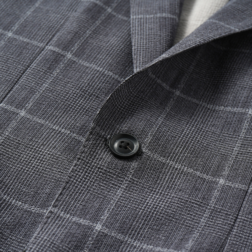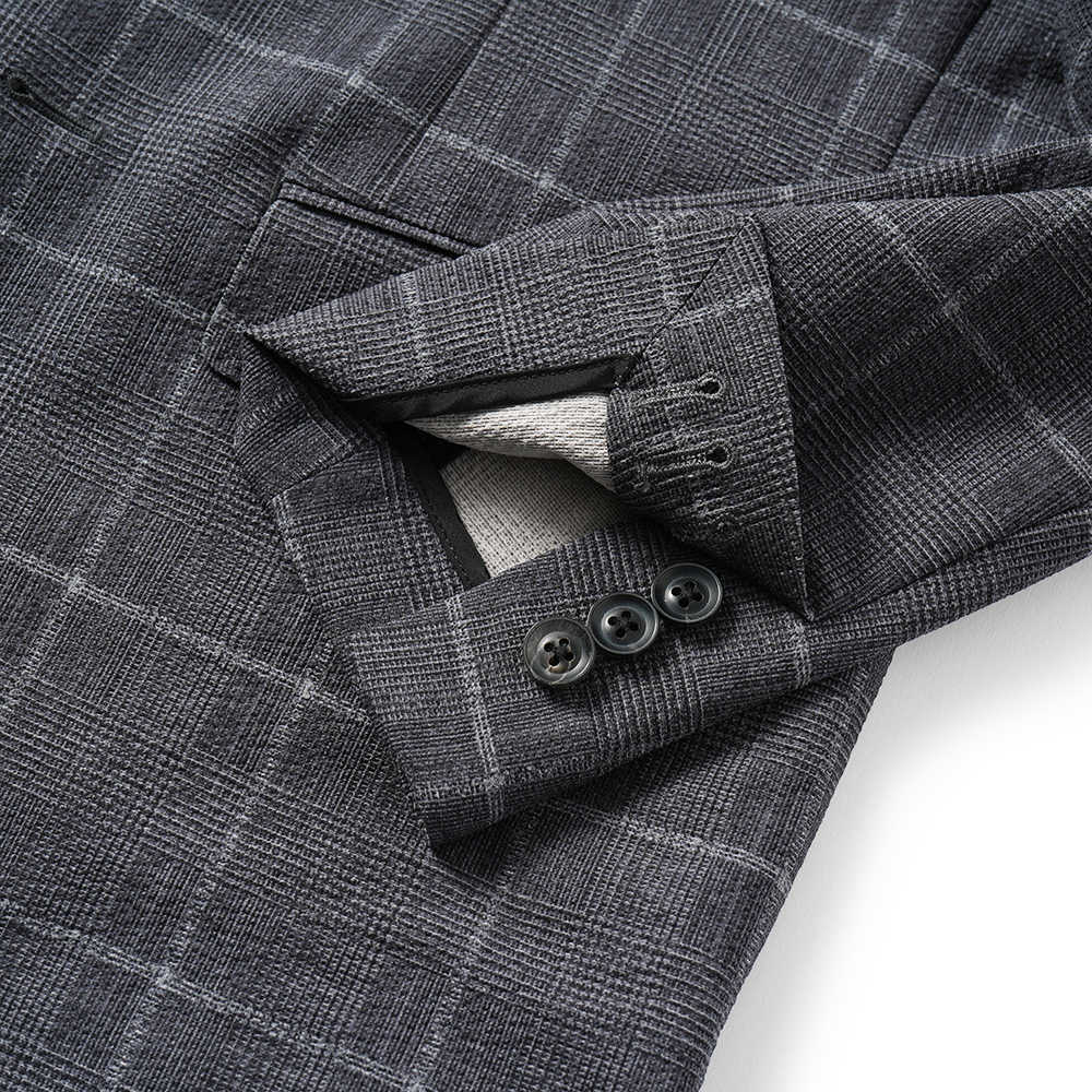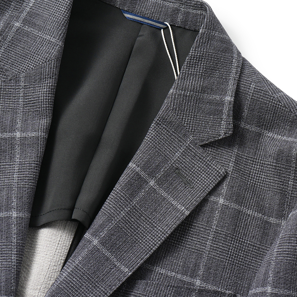 シアサッカー調の生地にチェック柄をあしらい、いつもの無地セットアップとは違った雰囲気に。
