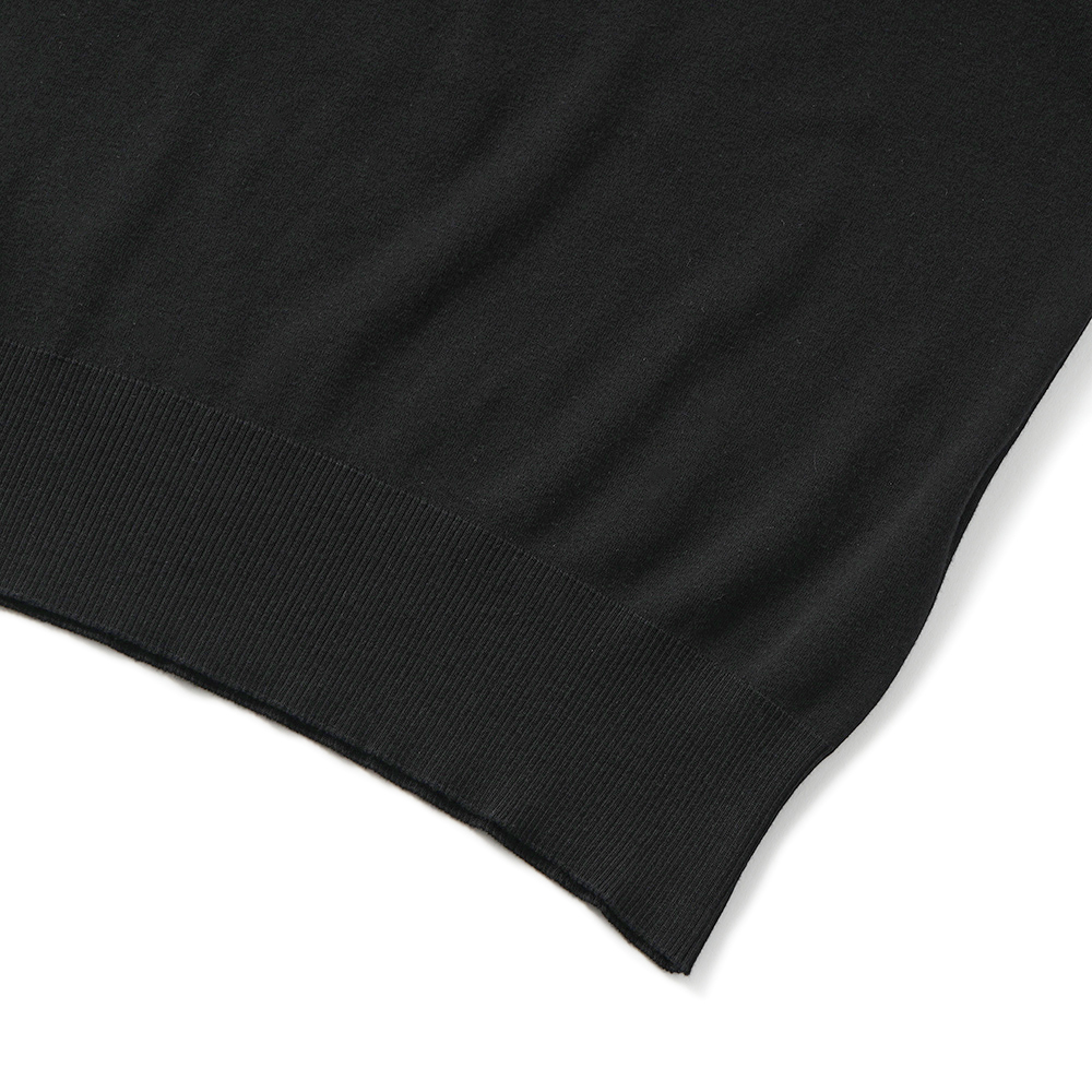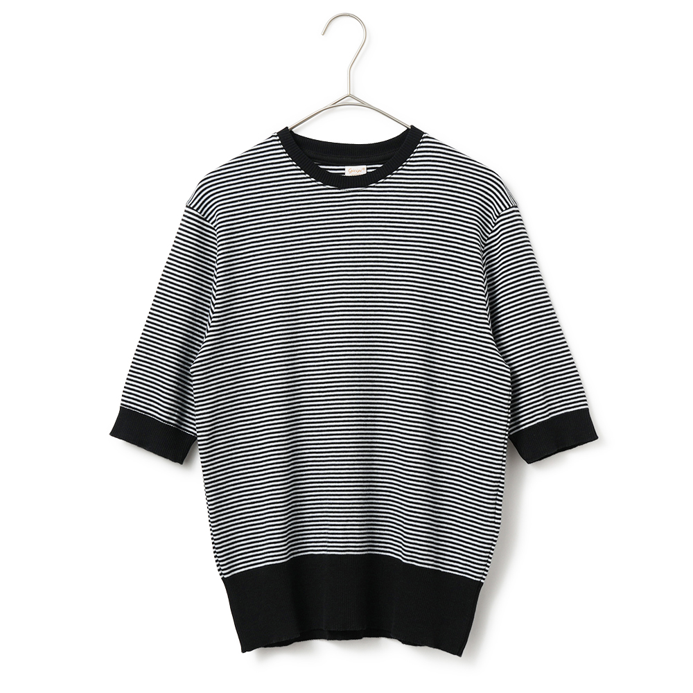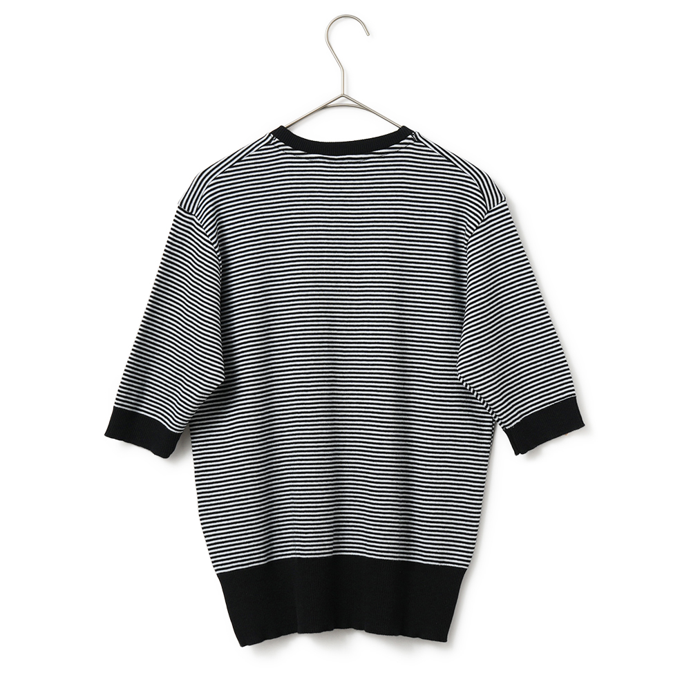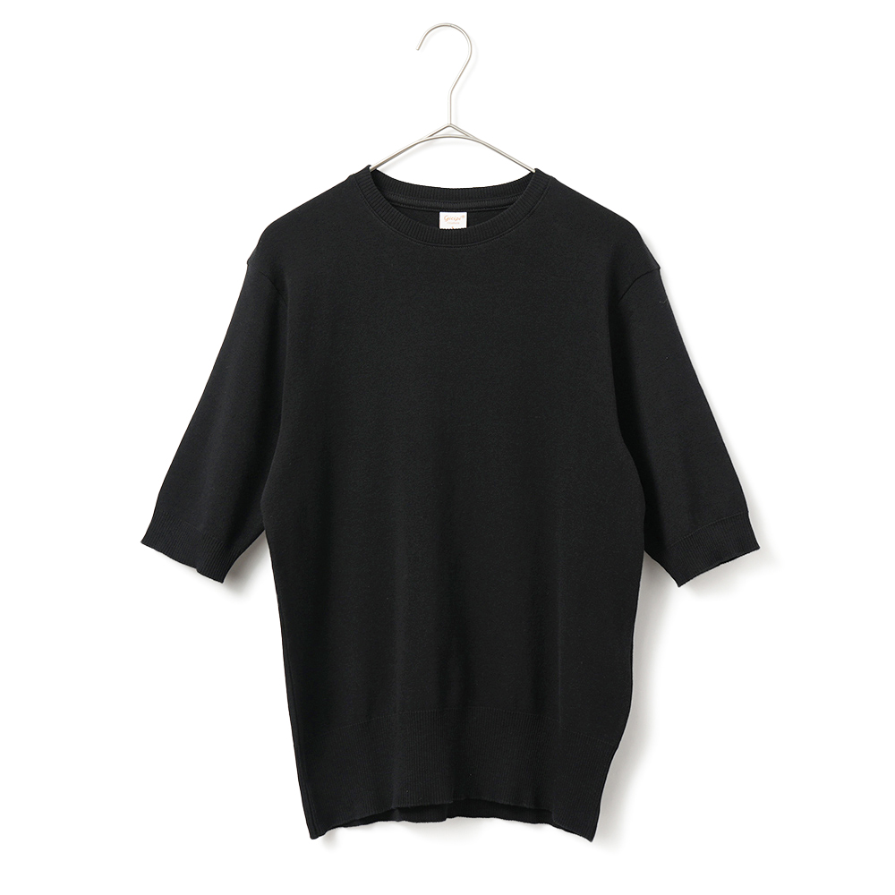 程よいフィット感のシルエット、首元は詰まったクルーネック、袖と裾はシームレス2×2のリブ仕上げでニットのような上品な印象です。