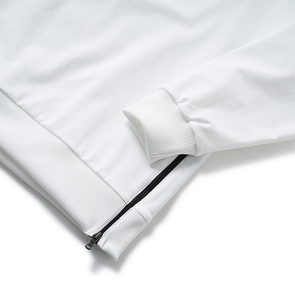 袖口と裾はリブ仕様でフィット感を高め、左脇のファスナーは着脱を容易にするだけでなく、スタイリングのアクセントとしても機能します。